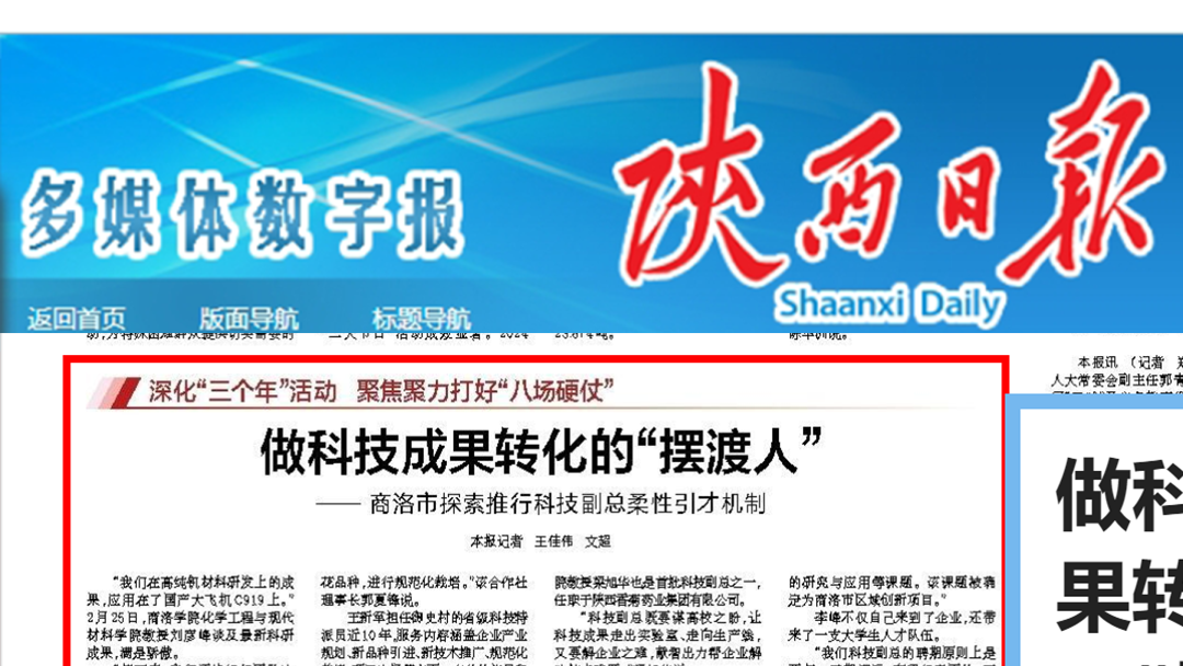从科技特派员到科技副总,今年会官方网站的科研工作者多年来始终坚持“扎根商洛大地做学问”,纷纷走出实验室,到市内企业兼任科技副总经理、副总工程师、技术副总、科技顾问等职务,献智出力帮企业解决技术难题。日前,《陕西日报》2版要闻栏目,以《做科技成果转化的“摆渡人”》为题,专题报道介绍了今年会官方网站科研工作者把论文“写”在商洛市“一都四区”建设产业链上的做法和经验。报道全文如下:做科技成果转化的“摆渡人”——...