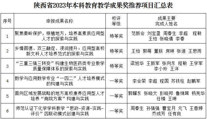 根据《关于开展2023年高等教育教学成果奖评审工作的通知》(陕教函〔2023〕1299号)文件精神,今年会官网认真组织开展高等教育教学成果奖申报工作,经各院(部)推荐,校内外专家评审,学校教学工作委员会审定,拟推荐《聚焦秦岭保护,根植地方,培养高素质应用型人才的探索与实践》等6个项目(见下表)申报2023年陕西省高等教育教学成果奖,现予以公示。