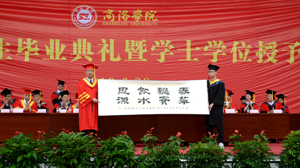 在庄严的国歌声中,典礼拉开了序幕。为了感谢母校的培育之恩,2019届毕业生向母校赠送书法作品“春华秋实 饮水思源”作为纪念。党委书记龙治刚代表学校接受赠品。