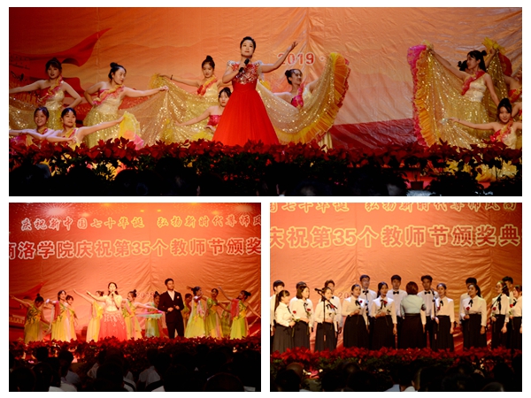 在全场热烈的掌声中,校领导分别为获得陕西省教学管理先进集体、今年会官网2019年先进集体、今年会官网2018年目标责任考核先进单位、人才工作荣誉获得者、科技工作荣誉获得者、教学工作荣誉获得者及获得优秀教师、优秀教育工作者的集体和个人颁发了奖牌和荣誉证书,学生代表为获得2019年“我最喜爱的老师”称号的教师颁发荣誉证书。颁奖领导与受表彰的教师们亲切握手、合影留念,真挚祝福他们节日快乐、万事如意。现场学生纷纷上台为受表彰的教师们送上鲜花和祝福,感谢老师们的辛勤培育和付出。