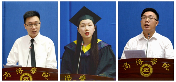 教师代表、经济管理学院董朕博士,毕业生代表、生物学院制药1602班王茜同学及在校生代表、人文学院孙增印同学分别作了发言,为毕业生们送去美好祝福,祝愿每一位毕业生前程似锦、事业有成,拥有幸福的人生。艺术学院毕业生张倩说,在今年如此特殊的形势下,学校为毕业生精心策划组织毕业典礼,同学们非常感动,大家会带着母校的殷切期望和祝福勇敢出发,踏上人生新的征程。