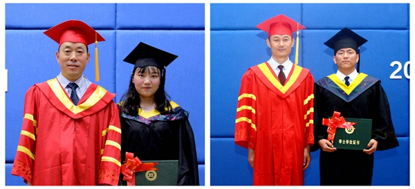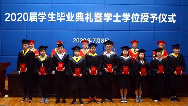 毕业典礼在校歌《正道直行做栋梁》中圆满结束。在随后举行的学士学位授予仪式上,毕业生们依次走上主席台,党委副书记彭虎军、副校长刘勇分别为获得学士学位的毕业生正冠拨穗、颁发学位证书,并与同学们合影留念。