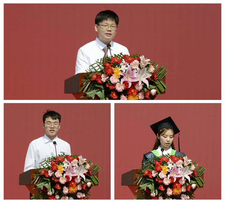 教师代表、建工学院秦进博士,在校学生代表、人文学院陶亮分别作了发言,为毕业生们送去了美好祝福。毕业生代表刘昕怡代表全体毕业生感谢母校的培育之恩,表示将践行“博闻强志正道直行”校训,更加勤奋、更加拼搏,以优异的成绩为母校争光。