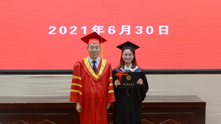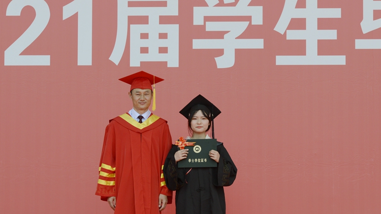 在学士学位授予仪式上,毕业生们依次走上主席台,校党委副书记彭虎军、刘勇,副校长刘宝盈、王新军分别为获得学士学位的毕业生正冠拨苏、颁发学位证书,并与他们一一合影留念。