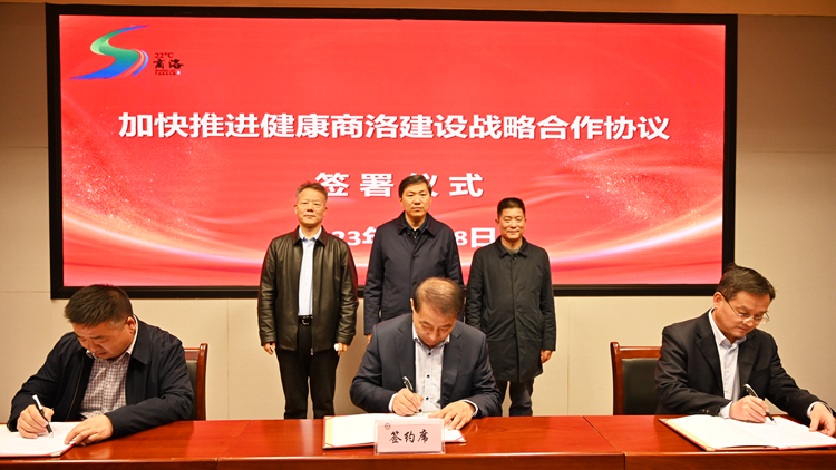 副校长王新军、商洛市卫生健康委员会主任马建琦、健康商洛建设工作领导小组办公室常务副主任何鹏超分别代表校地三方签署《加快推进健康商洛建设战略合作协议》。
