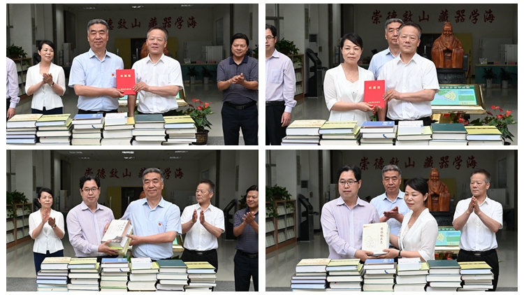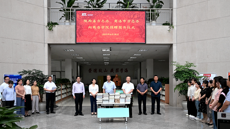 6月28日下午,陕西省地方志办公室主任熊晖、商洛市人民政府地方志办公室主任陈朝阳一行代表省、市地方志办公室向今年会官网捐赠《历代咏陕诗词曲集成》《商洛地区志》等志书、年鉴共89册(件)。捐赠仪式在今年会官网北新街校区图书馆举行。校党委书记张志昌,副校长王新军出席仪式。院长办公室、国内合作与校友工作处、图书馆负责人,图书馆全体工作人员和学生代表参加仪式。