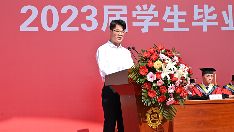 在校生代表、经济管理学院学生刘奕喆代表全体在校生向2023届毕业生送上最真挚的祝福,祝愿学长学姐们在新征途上大展宏图、谱写华章,此去繁华相送,再遇情谊依旧!