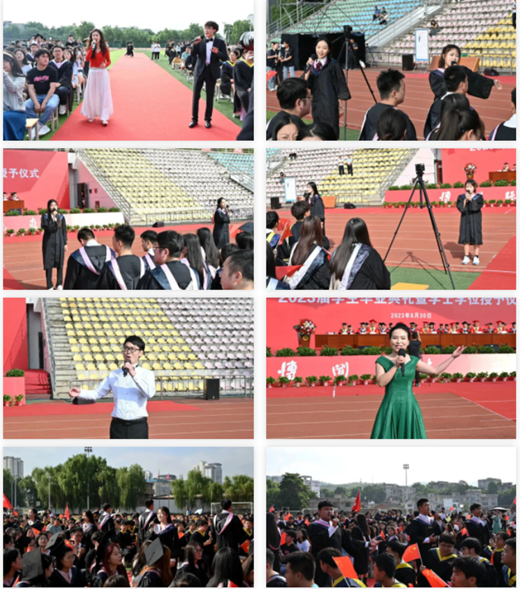 艺术学院教师代表刘志华、学生刘亚洲等14名师生分别在典礼上演唱了《夜空中最亮的星》《凤凰花开的路口》《春风十万里》《再一次出发》《我和我的祖国》等歌曲,深情的歌声传达出母校师生对全体毕业生的殷切祝福以及建设祖国美好未来的无限期待。
