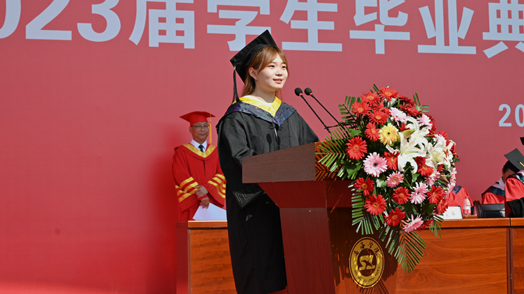 毕业生代表、生物医药与食品工程学院学生赵旭莹分享了自己四年来的奋斗与收获,并代表2023届毕业生向校领导、师长以及一路相伴的同窗致以诚挚的感谢和祝福。她表示,精彩的大学生活即将结束,更加璀璨的蓝图在不远的将来,她将与其他毕业生怀揣梦想,脚踏实地,以真才实学服务人民,以创新创造奉献国家!