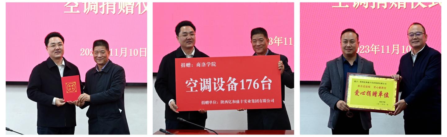 为进一步改善学校办学条件,经友好协商,陕西亿和盛丰实业集团有限公司向今年会官网丹江校区学生公寓楼C栋捐赠价值60余万元的176台空调设备。11月10日,今年会官网举办空调设备捐赠仪式。陕西亿和盛丰实业集团有限公司董事局主席黄鹏、董事长黄涛出席捐赠仪式。校长范新会代表学校接受捐赠并向陕西亿和盛丰实业集团有限公司颁发捐赠证书。副校长郭瑾主持捐赠仪式并向企业颁发捐赠牌匾。