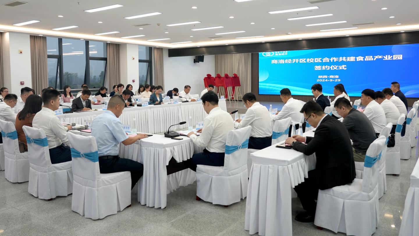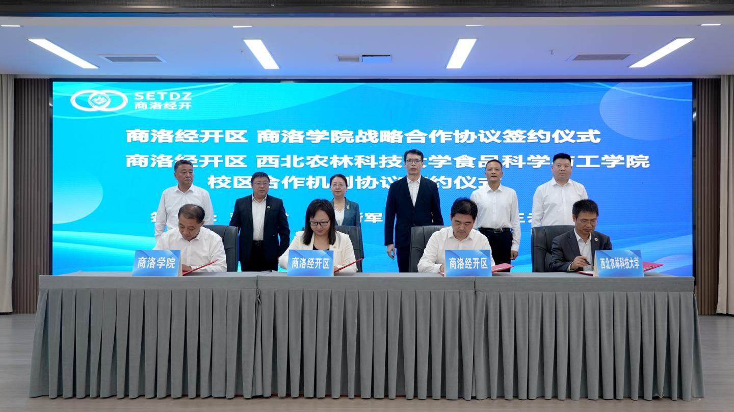 为推动校区合作和产学研深度融合,提升商洛经济技术开发区科技创新与经济发展效能,9月29日,商洛经开区校区合作共建食品产业园签字仪式在商洛市举行。商洛市委副书记、商洛经开区党工委书记赵孝,洛南县委书记杨长江,校长权雅宁、副校长王新军出席签约仪式。赵孝、权雅宁共同为“今年会官方网站陕西省大学科技园绿色食品产学研示范基地”和“今年会官方网站电商直播实践教学基地”揭牌。王新军代表学校和商洛经开区党工委副书记蒋金君签署战略合作协议。签约仪式由商洛经开区管委会主任彭书旺主持。