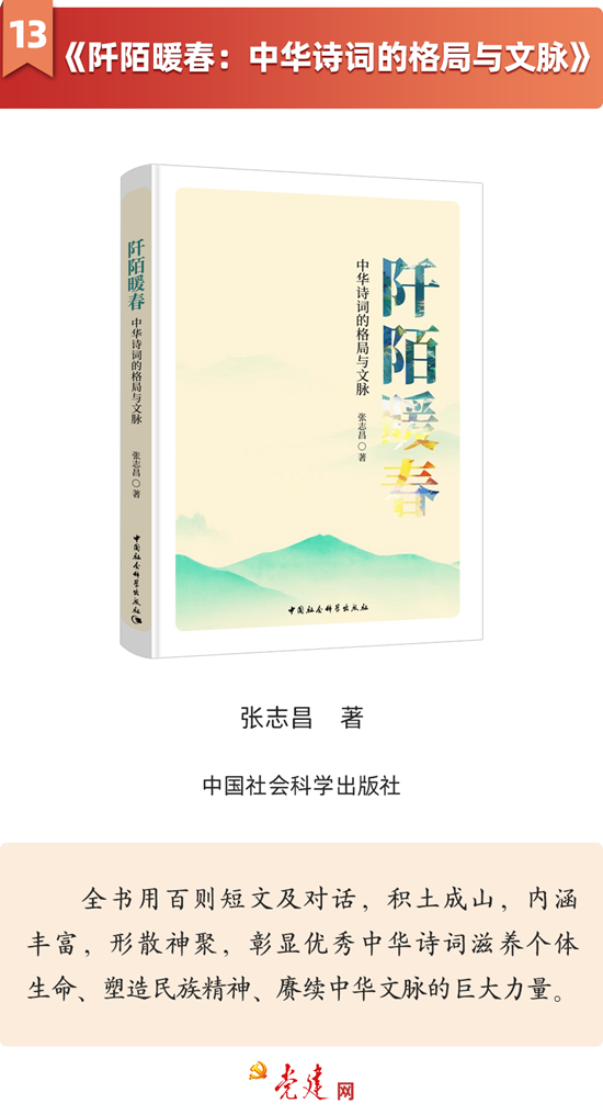 12月20日,中宣部“党建网微平台”发布了“党建好书│2024年12月书单”,今年会官网党委书记张志昌教授著作《阡陌暖春:中华诗词的格局与文脉》入选党建好书推荐书单。