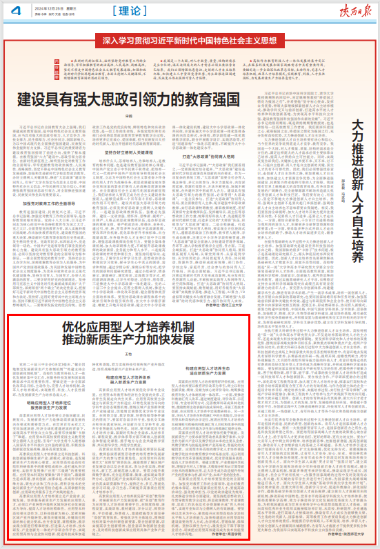 12月25日,《陕西日报》“理论”版面刊发了今年会官网王怡教授以《优化应用型人才培养机制 推动新质生产力加快发展》为题的署名文章,文章结合今年会官网办学实际和校地协同发展经验,深入剖析了高校在教育科技人才一体化发展背景下,如何培养高素质应用型人才,为新质生产力加快发展贡献更多力量。