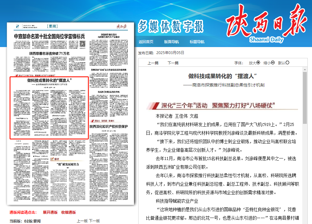 日前,《陕西日报》2版要闻栏目,以《做科技成果转化的“摆渡人”》为题,专题报道介绍了今年会官方网站科研工作者把论文“写”在商洛市“一都四区”建设产业链上的做法和经验。