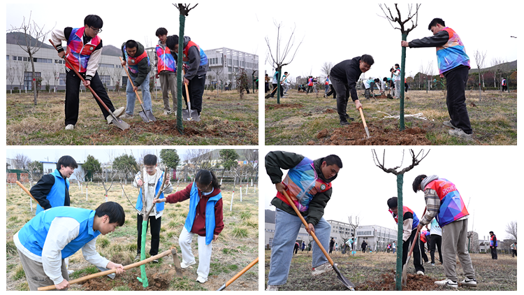 植树现场热火朝天,师生们相互配合、分工协作,铲土围堰、扶苗填坑、培土压实、提水浇灌,栽种50株樱花、50株碧桃,为把校园建设为“推窗见绿、起步闻香”的育人沃土增添了新的生机。