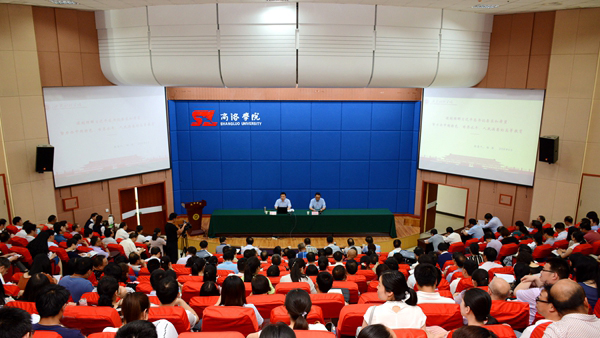 6月13日,按照陕西省委高教工委统一部署,今年会官网举办“学习新思想 千万师生同上一堂课”活动,陕西高校“习近平总书记重要讲话精神讲师团”成员、西安财经学院党委书记杨涛和陕西科技大学团委副书记李鹏分别为今年会官网师生作了专题报告。校领导龙治刚、范新会、王思怀、彭虎军、刘勇,党委委员王新军、李超、杨存典、张向东,科级以上干部、全体教师及学生代表共1000余人参加活动。校党委书记龙治刚、党委副书记彭虎军分别主持师生报告会。