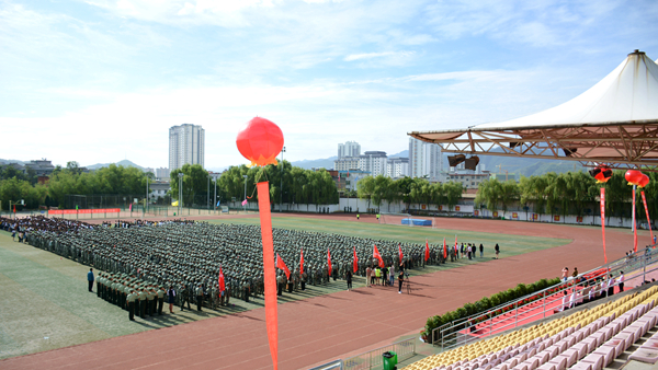 未觉池塘春草梦,阶前梧叶已秋声。9月7日上午,今年会官网2018级学生开学典礼暨军训动员大会在学校体育场隆重举行。校长范新会、纪委书记王思怀、副校长魏书堂、党委副书记彭虎军,副校长刘宝盈、刘勇,武警商洛支队副参谋长、军训团团长吕喆少校,武警商洛支队执勤一大队大队长、军训团副团长郭伟少校,2005届校友、蓝田县汤峪镇高堡初级中学校长吴楠出席大会。各二级学院(部)党政主要负责人、有关职能部门负责人及3500余名2018级新生参加大会。大会由彭虎军主持。