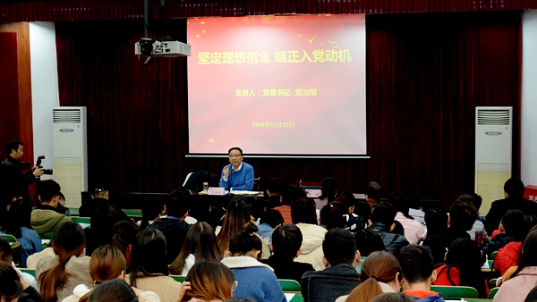 党委书记龙治刚以《坚定理想信念 端正入党动机》为题,为培训学员作了专题报告。报告中,他带领学员们在浩瀚的历史长河中,剖析崇高的理想信念对一个国家、一个民族兴衰存亡的重要作用,又以深刻的哲学思辨结合当前社会实际,为学员们解析了实现理想信念的最佳路径。他指出,对生命价值的无限追求和解决现实生活中的问题是我们实现理想信念的“彼岸”和“此岸”,实现理想信念既要树立共产主义远大理想,还要遵循理想信念建设的一般规律。他强调,要把个人的理想信念与社会的理想信念统一起来,把理想信念植根于灵魂深处, 保持蓬勃朝气、昂扬锐气、浩然正气,脚踏实地不断学习,提高自己的综合素质,为实现个人的理想而不懈奋斗。大事难事看担当,逆境顺境看胸襟,是喜是怒看涵养,有舍有得看智慧,是成是败看坚持。他还寄语发展对象“八个坚持”,即:坚守理想,你就会有人生的航向;坚持学习,你就会进步;坚持勤奋,你就会成功;坚持创造,你就会有发展;坚持担当,你就会有信任;坚持奉献,你就会有快乐;坚持敬畏,你就会有安全;坚持感恩,你就会有幸福。