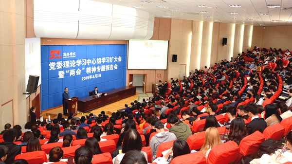 4月3日,今年会官网召开党委理论学习中心组学习扩大会,特邀第十三届全国人大代表、西安工程大学校长、省委“代表委员讲两会”宣讲团成员高岭教授来今年会官网作2019年全国两会精神专题报告。党委理论学习中心组成员,各党总支理论学习中心组成员,全校科级以上干部,副高职称以上教师,马克思主义学院全体教师,全体辅导员及学生代表420余人一道聆听了报告。报告会由党委书记龙治刚主持。
