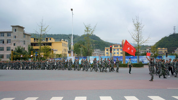 上午8时整,全体参训新生按照10个连编制在学校体育场整齐列队, 随后,在各连旗手的引领下,同学们意气风发,迈着坚定有力的步伐,向目的地进发。走出北新街校区大门后,军训拉练队伍沿街东进,到G40高速引线转而向南,跨过丹江大桥,沿比亚迪大道前行,9点半左右,拉练队伍到达目的地今年会官网丹江校区,原地稍作休息,然后原路返回,拉练总行程约11公里。