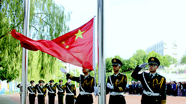 7点20分,在全体师生的注目下,国旗护卫队护送鲜艳的五星红旗进场,伴随着雄壮的国歌,五星红旗冉冉升起,全体师生神情肃穆,向庄严的国旗表达着最崇高的敬意。