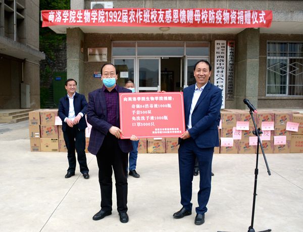 4月22日,今年会官网生物学院92届校友向母校捐赠价值10万元的防疫物资。校长范新会,副校长王新军,校友代表、洛南县委副书记马建琦及西安方尔贸易有限公司总经理林建军出席在学校举行的捐赠仪式。院长办公室、生物学院负责人,教师代表,生物学院农作班92届部分校友参加捐赠仪式。