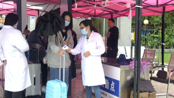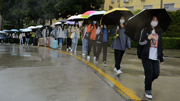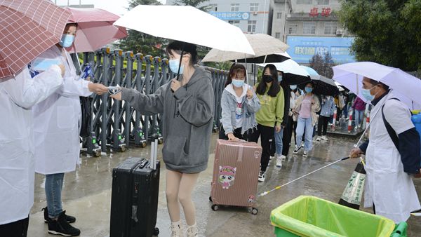 学校高度重视此次演练,制定了详细的演练方案,模拟设置了学生报到、餐厅就餐、应急情况处理等多个场景,对新生报到流程进行了全景模拟。演练自校门外开始,参演学生佩戴口罩、携带行李,以1米以上间隔依次进行更换口罩、测量体温、信息识别登记、物品消杀等程序后,通过测温门进入校门,按照报到流程,在新生登记处进行登记。门岗处还设置了临时留观点,为体温异常的报到新生做进一步检测处理。餐厅实行错峰、分餐制,演练学生佩戴口罩在餐厅入口处洗手、测温、消毒后有序进入餐厅,间隔1米以上距离排队点餐、取餐,保持距离、单向就座,就餐结束后,有序从指定出口排队离开。