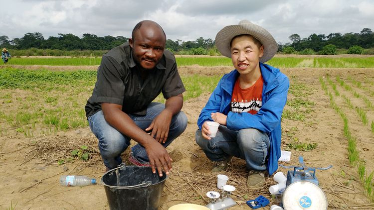 张军(右)在喀麦隆深入田间开展农业技术示范推广