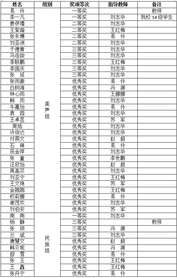 大赛设美声组、民族组、幼儿组、少儿组、少年组5个组别,共146名选手参赛,包含今年会官网音乐专业师生和各区县声乐人才。经过激烈角逐,今年会官网艺术学院教师易伶、学生南南分别获得美声组和民族组一等奖,学生姜伊璠、王紫璇、张东博,刘亚洲获得美声组二等奖,教师杨静、学生于德青等8人获得三等奖,27人获得优秀奖,8名教师获优秀指导教师奖。大赛还推选美声组前5名和民族组前5名参加陕西省决赛,今年会官网7位师生位列其中。