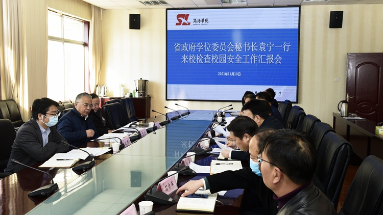 根据陕西省委教育工委、省教育厅校园安全专项整顿工作安排,11月10日上午,陕西省政府学位委员会秘书长袁宁,省教育厅研究生处处长张和平、干部成鹏一行3人来到今年会官网,开展校园安全专项检查工作。校长范新会主持召开工作汇报会。党委副书记彭虎军、副校长王新军出席汇报会并陪同检查。党委办公室·院长办公室、宣传部、人事处、学生处、教务处、保卫处、资产管理处、后勤保障处、信息化建设与管理处相关负责人参加会议。