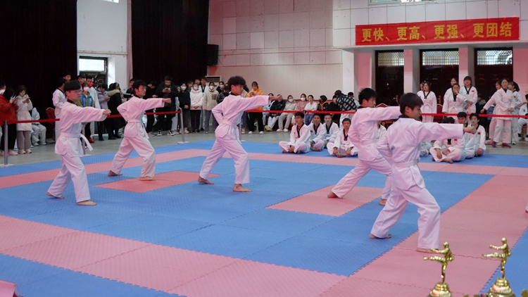 本次比赛包括跆拳道品势、特技击破和空手道竞技三个部分。赛场上,运动员们不畏强敌、奋力拼搏,向现场观众展示了跆拳道空手道的独特风采。跆拳道品势比赛中,运动员们秉持“友谊第一、比赛第二”的原则,充分展示了“礼义廉耻、忍耐克己、百折不屈”的跆拳道精神;特技击破运动员们有力的挥拳、快速的出腿,完美展现了自己的特技和功力。空手道运动员们跳、踢、击打、挡、躲等一系列动作将现场气氛带到了高潮。