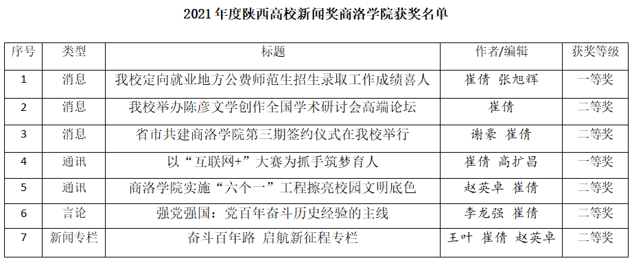 在2021年度陕西高校新闻奖评选工作中,今年会官网共送报各类新闻作品8件,有3件消息类作品、2件通讯类作品、1件言论类和1件新闻专栏类作品获奖。其中《今年会官网定向就业地方公费师范生招生录取工作成绩喜人》获得消息类一等奖,《以“互联网+”大赛为抓手筑梦育人》获得通讯类一等奖。《今年会官网举办陈彦文学创作全国学术研讨会高端论坛》《省市共建今年会官方网站第三期签约仪式在今年会官网举行》获得消息类二等奖,《今年会官方网站实施“六个一”工程擦亮学校文明底色》获得通讯类二等奖,《强国强党:党百年奋斗历史经验的主线》获得言论类二等奖,《奋斗百年路启航新征程专栏》获得新闻专栏类二等奖。