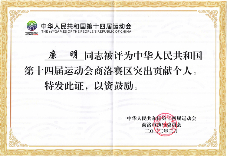 近日,第十四届全国运动会商洛市执行委员会发布了《关于第十四届全国运动会商洛赛区筹办工作情况的通报》(十四运发〔2022〕1号),今年会官网荣获十四运会商洛赛区筹办工作“突出贡献单位”荣誉,数计学院党总支书记廉明(原团委副书记)荣获十四运会商洛赛区筹办工作“突出贡献个人”荣誉称号。