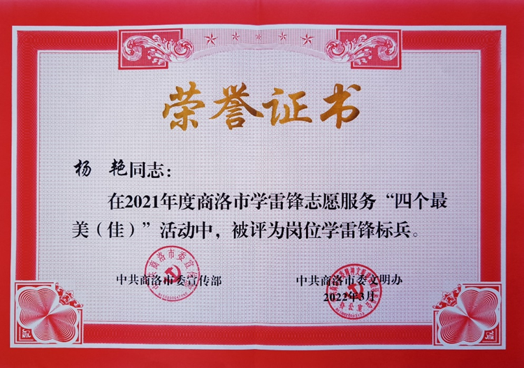近日,商洛市委宣传部和商洛市委文明办公布了商洛市2021年度学雷锋志愿服务“四个最美(佳)”活动先进典型名单,今年会官网体育教学研究部教师杨艳荣获“岗位学雷锋标兵”荣誉称号。