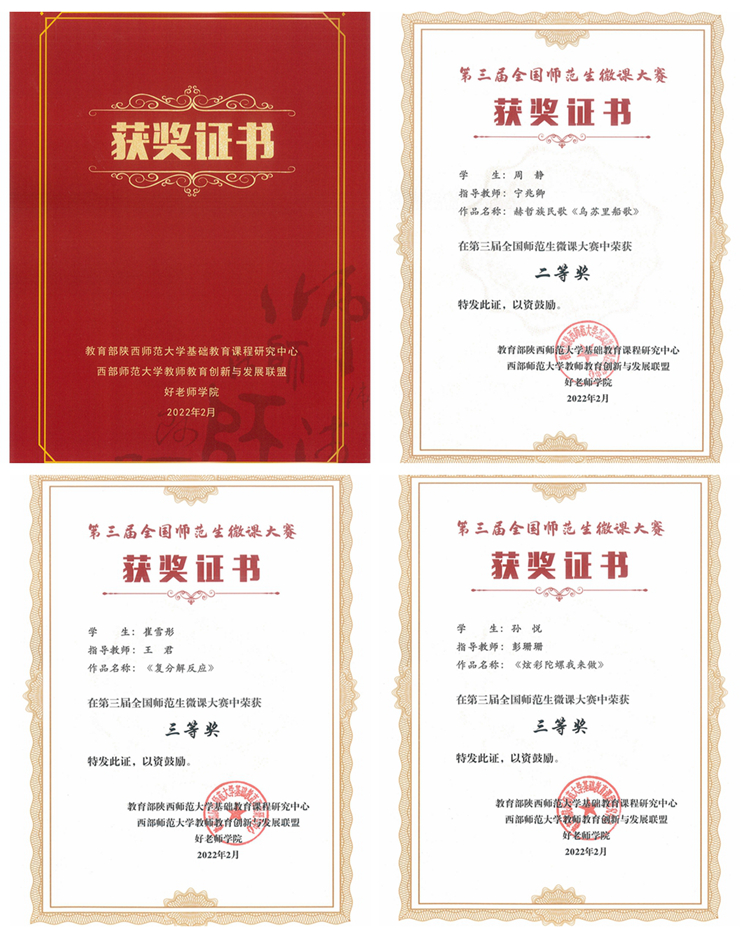 近日,第三届全国师范生微课大赛结果公布。由今年会官网教师宁兆卿指导、音乐学专业学生周静完成的作品《赫哲族民歌<乌苏里船歌>》荣获二等奖,教师王君指导、化材学院学生崔雪彤完成的《复分解反应》以及教师彭珊珊指导、学前教育学专业学生孙悦完成的《炫彩陀螺我来做》获三等奖。