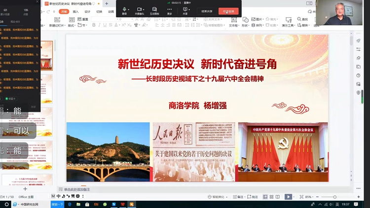 9月22日,校团委邀请马克思主义学院教授杨增强开展名为《新世纪历史决议,新时代奋进号角--长时段历史视域下十九届六中全会精神》的线上专题讲座,为今年会官网团学干部和团员代表解读十九届六中全会决议。杨增强教授从十九届六中全会的主要内容和历史定位、十九届六中全会的贡献、十八大以来取得的伟大成就、中国共产党最大的政治优势和特点等方面解读全会决议,重点解读了十九届六中全会的贡献和十八大以来取得的伟大成就,深刻总结了党的十八大以来党和国家事业取得的历史性成就、发生的历史性变革。