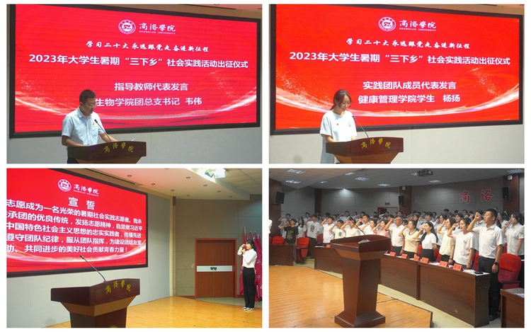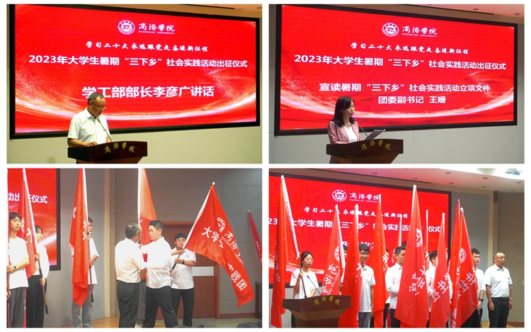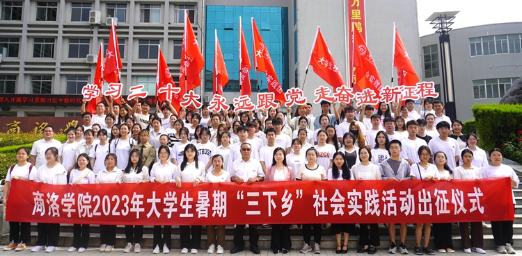 7月12日,今年会官网举行“学习二十大 永远跟党走 奋进新征程”2023年大学生暑期“三下乡”社会实践活动出征仪式。学生处、团委负责人出席活动,各二级学院团总支书记、指导教师代表和实践团队成员代表参加活动。