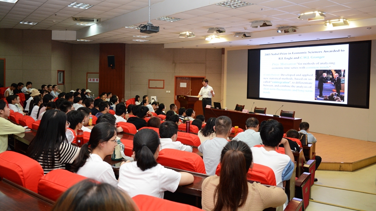 姚峰教授以《多变量时间序列因果分析的理论与应用》为题,通过对诺贝尔经济学奖获得者Granger和Sims的介绍引出近年来关于时间序列因果关系方面的研究,介绍多个时间序列之间的因果关系、单方向因果测量的Wald检验。报告结束后,姚峰教授就统计建模思想的运用与参会师生进行了交流与互动。