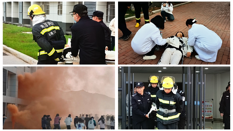 本次演练以丹江校区16C学生公寓楼起火为假设情景,共有火灾逃生、火场救援、灭火演示三个环节。随着火灾疏散警报声响起,“火灾现场”顿时浓烟滚滚,疏散演练拉开了序幕,全体学生按照设定的疏散路线,在辅导员、公寓管理员及校警的带领下,采取掩口鼻、弯腰姿势从宿舍快速有序地撤离到安全区域。消防员模拟“火场搜救被困学生”,医护人员立即对“受伤学生”进行模拟救治。消防员启动消防车在火灾现场进行“灭火演示”。整个演练过程逼真、井然有序、达到预期目标。