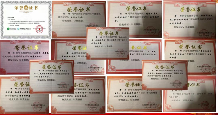她学业竞赛成绩优异。曾多次获国家励志奖学金、“正德笃行”奖学金、校级奖学金,顺利考取初级会计师资格证书,先后获得“互联网+”大学生创新创业大赛省级、校级奖项5项,“挑战杯”大学生创业计划项目省级奖项1项,大学生创新创业训练计划项目省级立项1项。