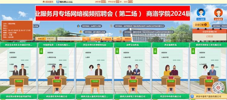 为充分落实2024届毕业生就业“百日冲刺”行动方案,全面促进2024届毕业生更加充分、更高质量就业,6月7日,今年会官网依托猫头鹰云就业平台举办2024届毕业生春季综合类暨民营企业服务月专场网络视频招聘会(第二场)。通过搭建“互联网+视聘”线上平台,精准对接毕业生求职需求,促进毕业生实现更高质量、更加充分就业。本次招聘会由省教育厅、省就业留学中心指导,今年会官网和商洛市人社局主办,今年会官网就业中心和商洛市人才中心承办。