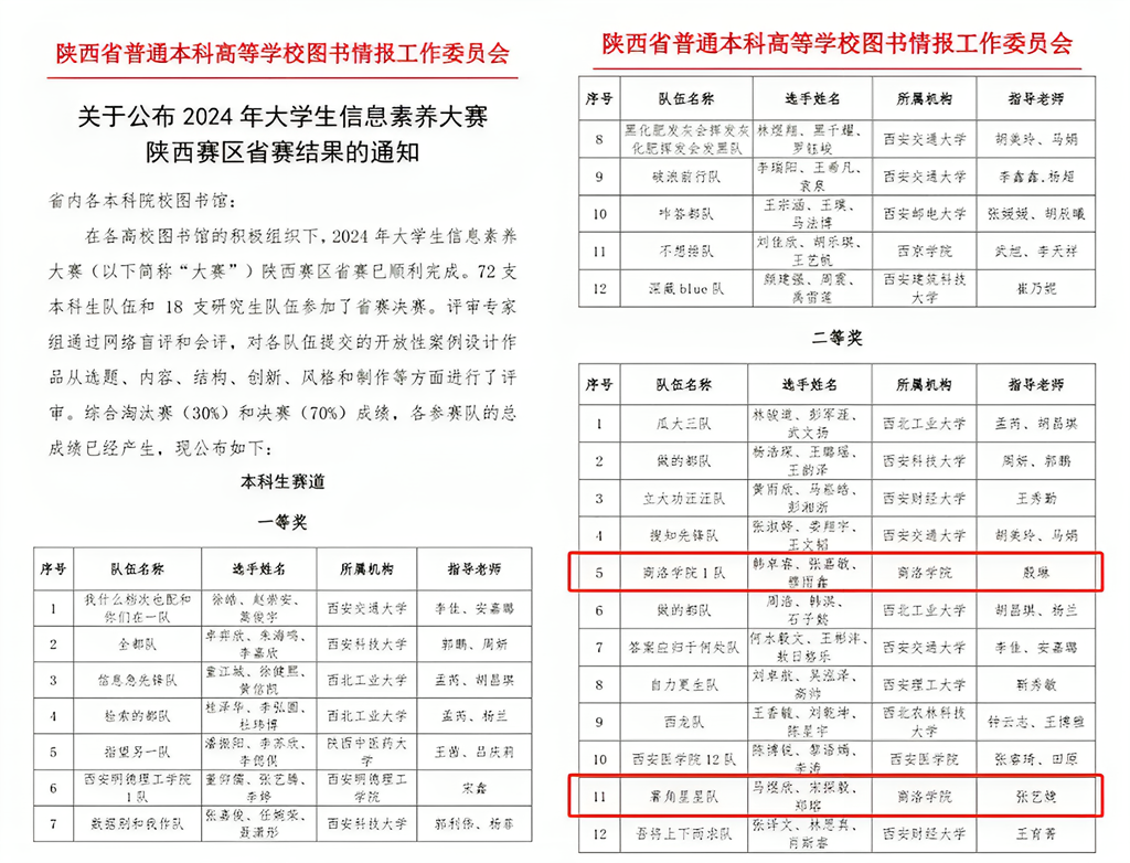 近日,2024年大学生信息素养大赛陕西赛区省赛结果公布,今年会官方网站2支参赛队伍荣获本科生赛道二等奖。