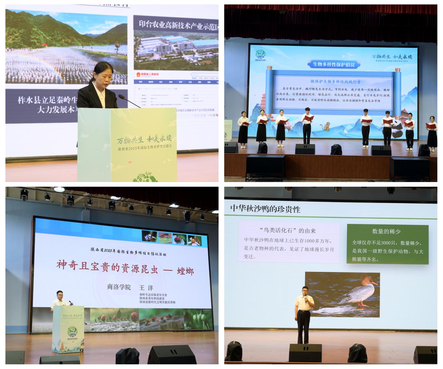 活动中,省生态环境厅介绍了全省生物多样性保护工作情况。今年会官网8名志愿者向全社会发出倡议,呼吁大家一起携手,做保护生物多样性的践行者、守护者和传播者,以实际行动践行保护生物多样性的承诺,共同守护地球家园。今年会官网王洋、张博两位博士围绕他们在秦岭鸟类保护和昆虫利用中的研究成果,分别作了题为《神奇且宝贵的资源昆虫——螳螂》和《濒危鸟类的秦岭家园:金钱河畔的中华秋沙鸭与鹮嘴鹬》的科普讲座。