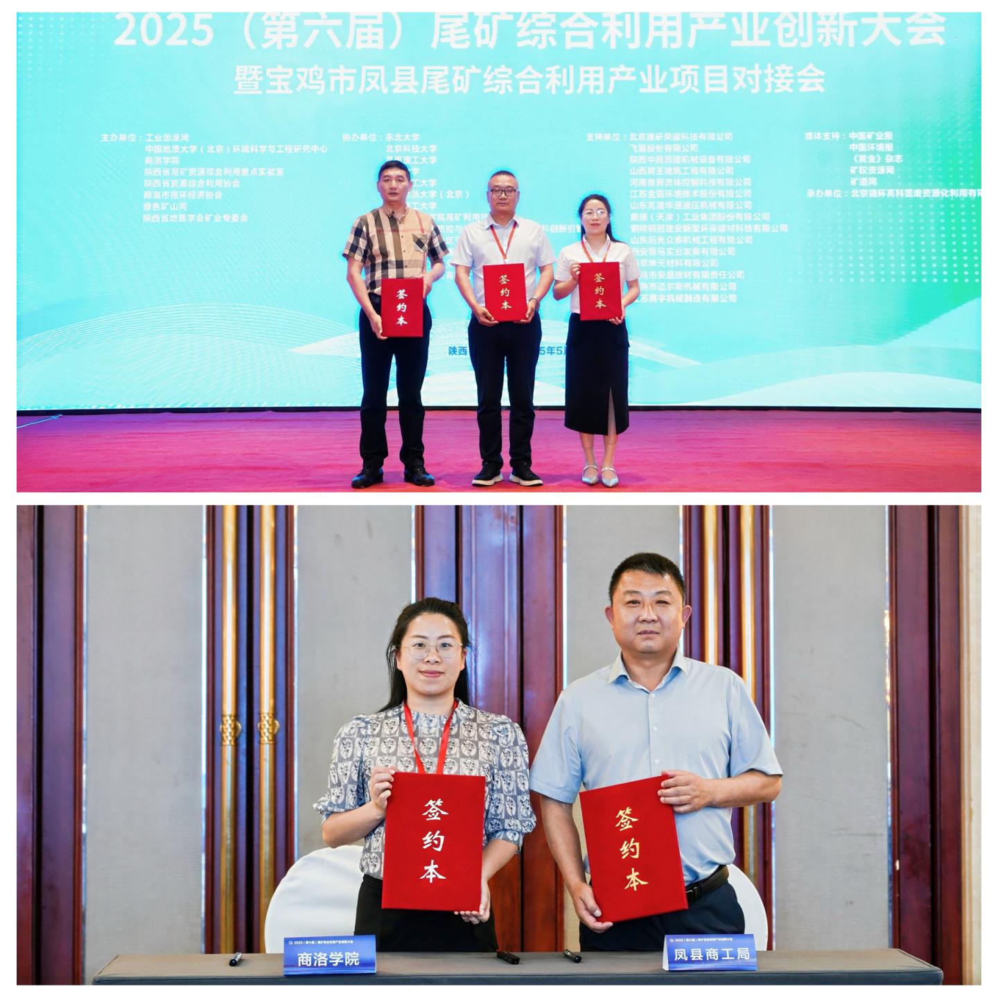 会上,曹宝月与山东高唐华通液压机械有限公司、商洛市循环经济协会负责人签订了“大宗固废领域高端智能装备开发与示范推广项目”校企合作协议,代表陕西省尾矿资源综合利用重点实验室与凤县商工局签订“尾矿综合利用技术支持战略合作协议”。