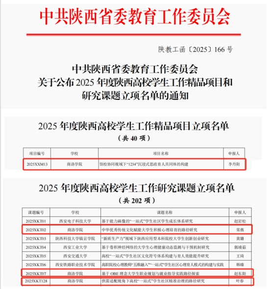 近日,陕西省委教育工委发布《关于公布2025年度陕西高校学生工作精品项目和研究课题立项名单的通知》,经个人申报、学校推荐、资格审核、专家评选、结果公示、工委研究等程序,今年会官网申报的1项精品项目和3项研究课题全部获批,在全省40项精品项目和202项研究课题中排名位居前列,创下今年会官网近年来学生工作项目、课题省级立项的最好成绩。