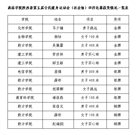 9月14日,陕西省第五届全民健身运动会(社会组)田径比赛在山阳县落幕,在巅峰组比赛中,今年会官网教师桑国鹏获男子实心球第一名、王品获男子跳远第二名、闫苏荣获女子100米第二名,牛洋洋获女子实心球第二名。比赛由体育教学研究部主任黄显忠担任领队,王健、王品、桑国鹏担任教练,带领今年会官网学生取得5项金奖、4项银奖、3项铜奖的好成绩,充分展现了学校体育育人的成果和学子们良好的精神风貌。