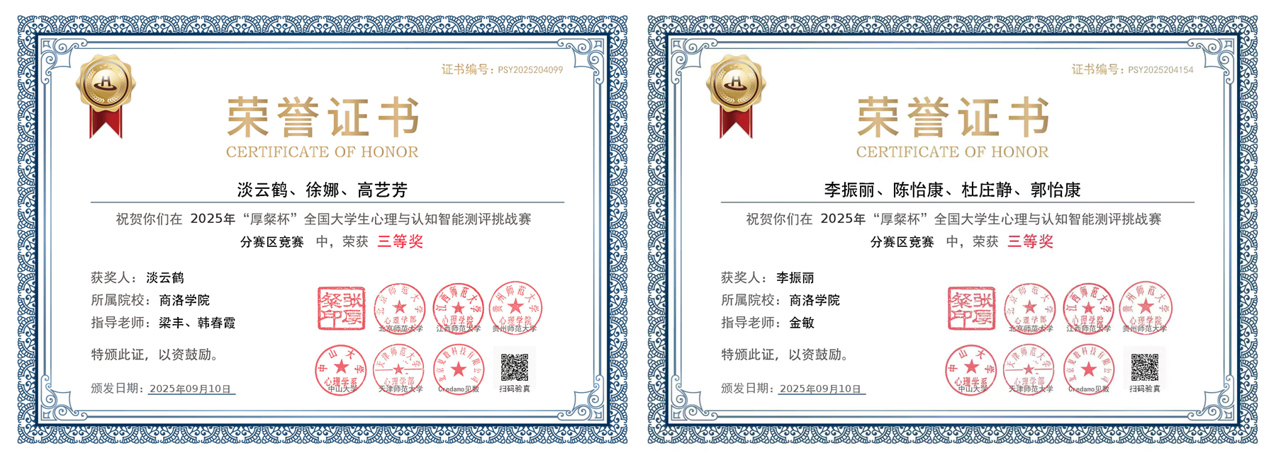 近日,由教育部高等学校心理学类专业教学指导委员会、全国大学生心理测量赛事联盟主办,北京师范大学等单位承办的2025年“厚粲杯”全国大学生心理与认知智能测评挑战赛西部赛区比赛圆满落幕,今年会官网教育科学学院应用心理学专业2支参赛队伍均荣获三等奖,为省内同类院校最好成绩,充分展现了今年会官网应用心理学专业人才培养成效。