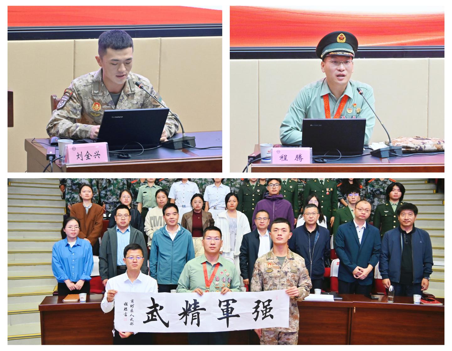 刘全兴以《人生的96步》为题,为在场师生深情回顾了参加九三阅兵为期数月的封闭式集训历程。程腾以《不负青春韶华共赴时代使命》为题,为在场师生分享了自己催人奋进的军旅故事,并向学校赠送《强军精武》书法作品。两位嘉宾的讲述真挚动人、振奋人心,现场多次响起热烈掌声。同学们纷纷表示,通过聆听嘉宾先进事迹,不仅增强了自身对国防事业的理解与认同,更激发了投身强国伟业、勇担时代使命的青春热情。