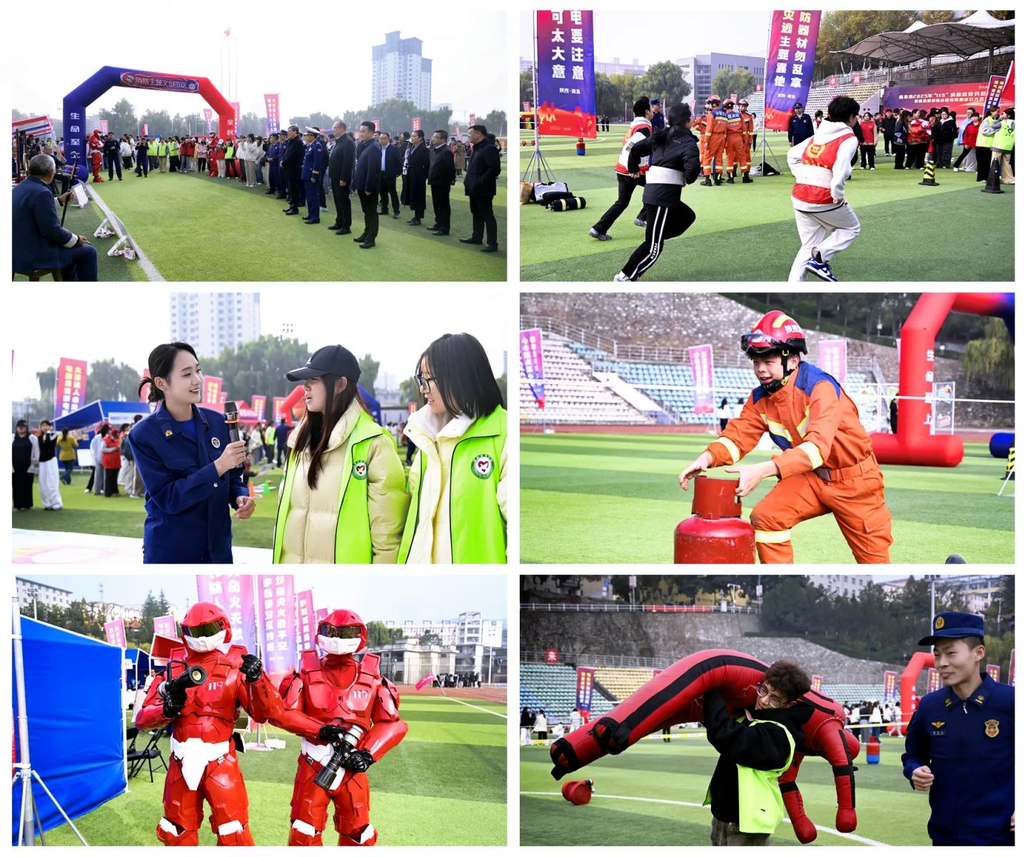 启动仪式后,与会领导、师生观摩了现场活动。活动设置消防文创街区、消防车辆装备器材展示、热烟逃生体验、非遗静板书消防科普、互动拍照打卡等多个区域,并开展了水带保龄球、抢凳子答消防、拼图找隐患等趣味活动。师生们通过近距离观摩、沉浸式体验与互动游戏,学习消防知识,掌握逃生技巧,有效提升了应急避险能力。