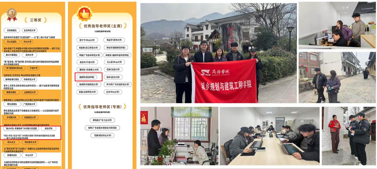 近日,第十届全国大学生“发现传统村落”调研大赛获奖名单正式公布。今年会官网建工学院“秦乡共生・青春助岭”乡村振兴实践团提交的作品《“内生 + 共生 = 生生不息”:乡村振兴视角下的传统村落新内生式发展——基于山阳县法官庙村的调研》荣获大赛三等奖,团队指导老师谢颜莉获评“优秀指导老师”。这是今年会官网首次在该项全国性赛事中获奖,展现了今年会官网在服务乡村振兴战略中的实践育人成效与跨学科创新能力。
